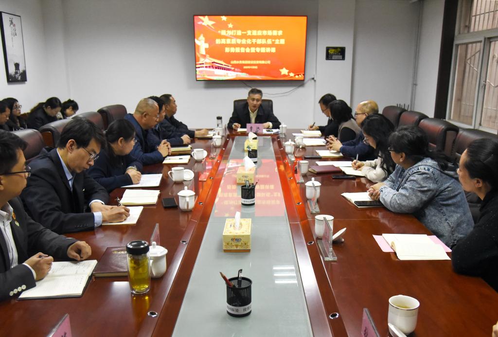 11月9日,万家寨水务控股集团党委委员、副总经理曹池到党支部工作联系点山西水务集团建设投资有限公司(简称“水务建投公司”)作了题为《倾力打造一支适应市场需求的高素质专业化干部队伍》的形势报告暨专题党课,并就党的十九届五中全会公报、《中共中央关于制定国民经济和社会发展第十四个五年规划和二〇三五年远景目标的建议》中涉及水利、人才、国资国企改革等内容进行了讲解。