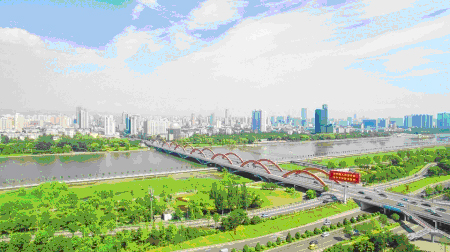 初夏的太原汾河景区,万木并秀、绿意葱茏。放眼望去,蓝天碧水、两岸锦绣,宛若一条玉带穿城而过。