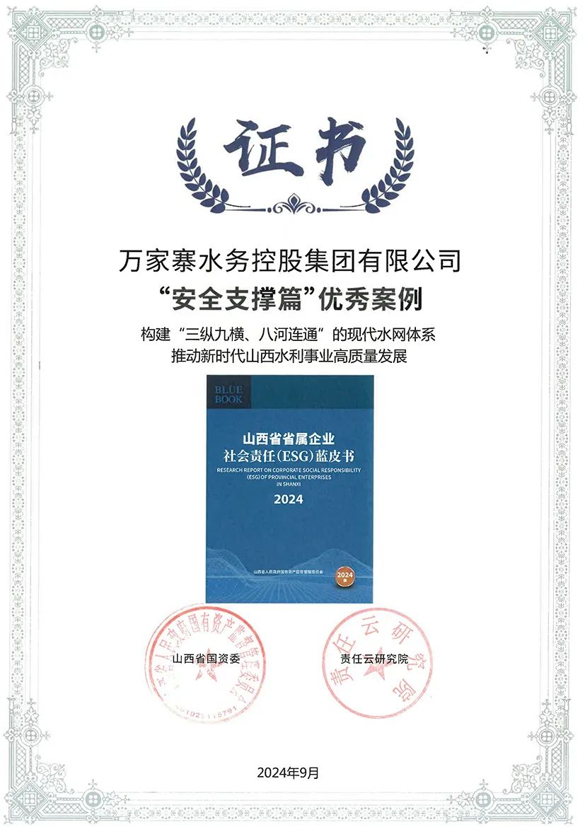 《山西省省属企业社会责任(ESG)蓝皮书(2024)》包含总论篇、指数篇、专题篇和案例篇四大部分。总论篇阐述了山西国资国企社会责任工作整体形势、发展思路和实践路径,指数篇量化分析、综合评价了省属企业履责情况,专题篇集中呈现了履责亮点和特色工作,案例篇设置党建引领篇、优质供给篇、安全生产篇、员工关爱篇、科技创新篇、产业引领篇、安全支撑篇、绿色发展篇、共同富裕篇、民生福祉篇、开放共享篇11个篇章,收录了60篇优秀案例,全方位、多层次地展示了省属企业的履责行动与成效。其中,万家寨水控集团的筑牢安全生产防线、构建“三纵九横、八河连通”现代水网体系、科学强化农村污水治理等3项案例入选《山西省省属企业社会责任(ESG)蓝皮书(2024)》,《构建“三纵九横、八河连通”现代水网体系,推动新时代山西水利事业高质量发展》获“安全支撑篇”优秀案例。