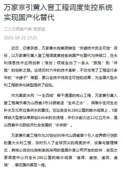 2025年信息技术应用创新解决方案应用推广大会在浙江杭州举办?;嵘?,2024信息技术应用创新解决方案入围名单揭晓。万家寨水控集团子公司万家寨引黄水务集团申报的“山西万家寨引黄调度集控系统”成功入围,成为全国水利行业唯一重点推荐应用案例?!罢飧鋈儆鹆考?,意味着我们研发的集控系统具有突出行业应用示范性,能替代进口,为水利水电领域关键基础设施提供成熟、全面的国产集中监控方案,有效降低对国外技术的依赖,筑牢智慧水利安全底线。”万家寨引黄水务集团扩机项目部负责人徐东文说。