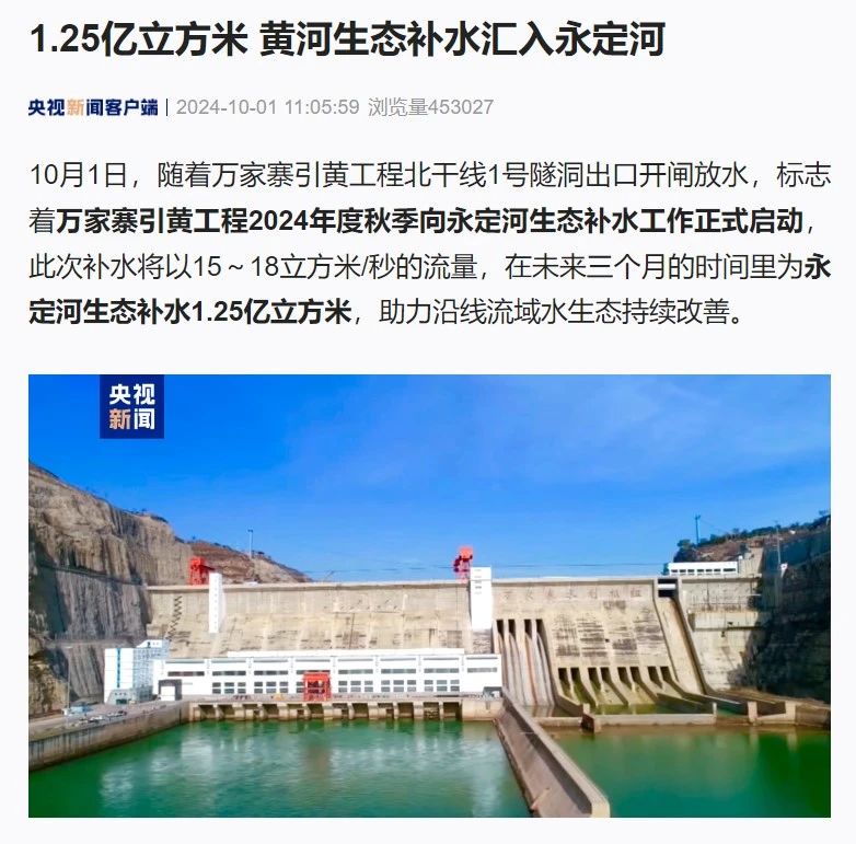 10月1日,随着万家寨引黄工程北干线1号隧洞出口开闸放水,标志着万家寨引黄工程2024年度秋季向永定河生态补水工作正式启动,此次补水将以15~18立方米/秒的流量,在未来三个月的时间里为永定河生态补水1.25亿立方米,助力沿线流域水生态持续改善。