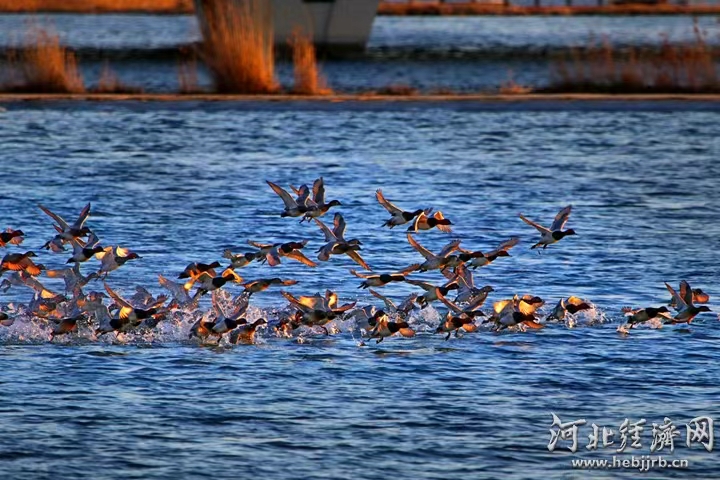 ▲永定河卢沟桥下,赤头潜鸭成群起飞。覃世明 摄