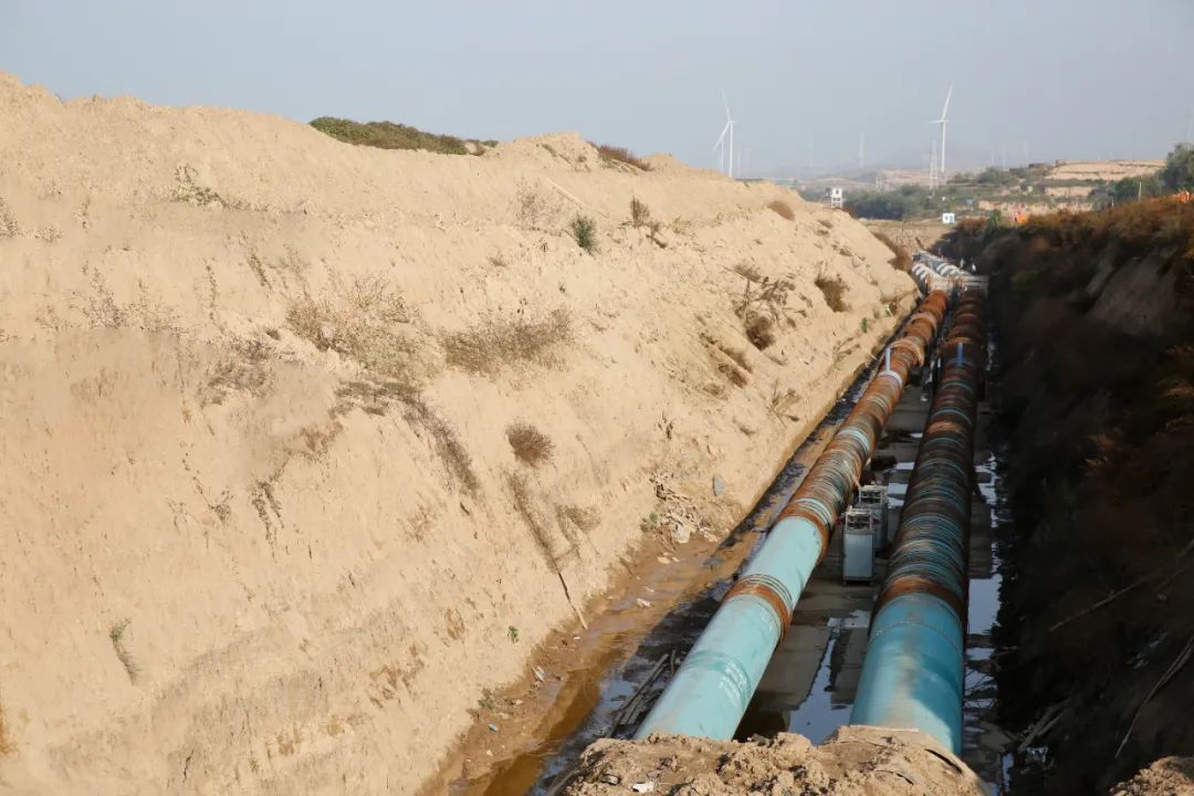▲施工15标全程55.621公里,目前已开挖30公里,管线铺设23公里。图为东一干边坡开挖管道安装