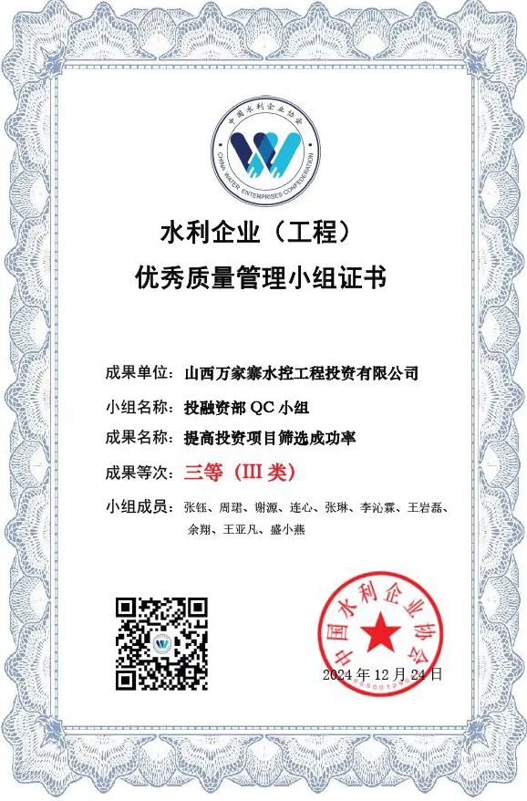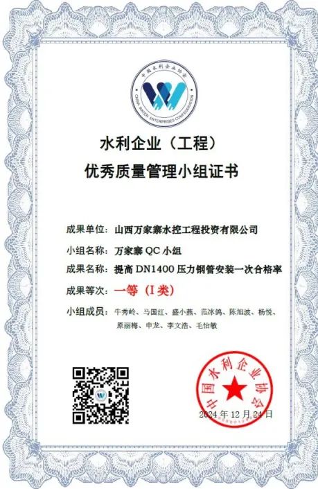 近日,中国水利企业协会公布的2024年度水利企业质量管理小组竞赛活动评价名单,工程投资公司报送的2项成果获奖,其中《提高DN1400压力钢管安装一次合格率》荣获一等成果,《提高投资项目筛选成功率》荣获三等成果。