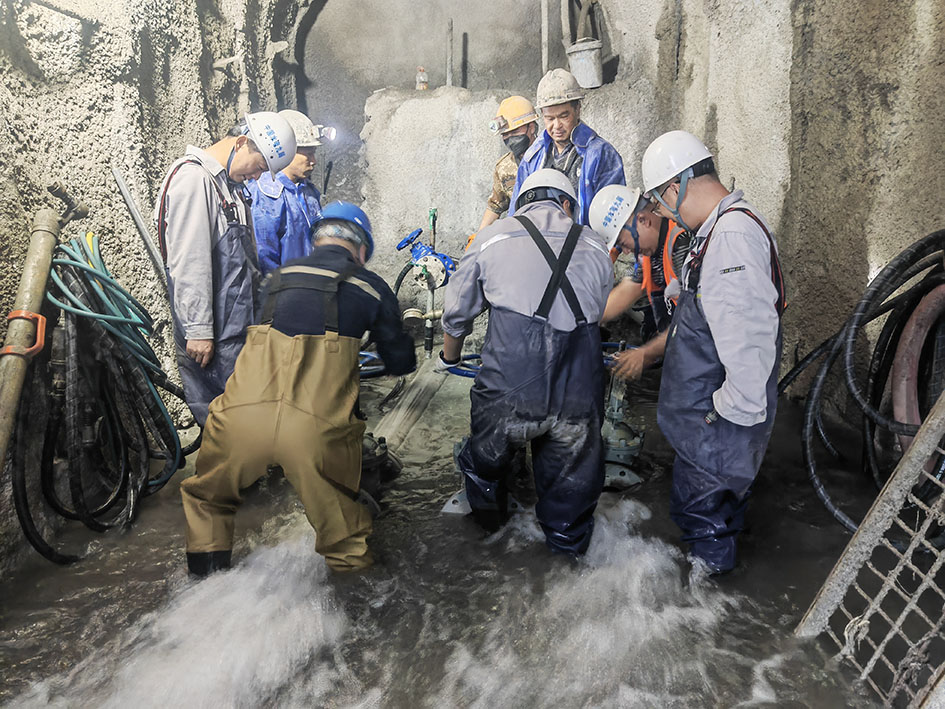 公司党委将党员先锋队作为加快推进剩余工程建设任务的有效抓手,以各参建单位党员为班底,分别在东、西干线成立党员联合先锋队,以点带面,有效激发一线党员担当精神,为项目建设与安全管理注入红色动力。2025年9月4日凌晨3点42分,施工23标(续)9号支洞控制主洞段下游突发大规模涌水,瞬间,洞内水位迅速上涨,施工被迫中断,工期面临严峻挑战。险情就是命令!公司第一时间启动应急响应,党员联合先锋队迅速集结,奔赴抢险一线。注浆队携带设备迅速对出水点进行封堵,后勤组紧急调配大功率抽排水设备,技术组实时监测水位,同步优化处置方案,“封堵-抽水-监测”的作战体系高效运转。