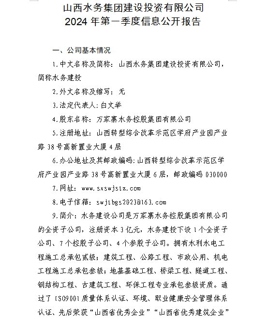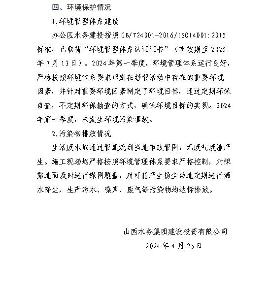 山西水投汾景水务有限公司2024年第一季度信息公开...