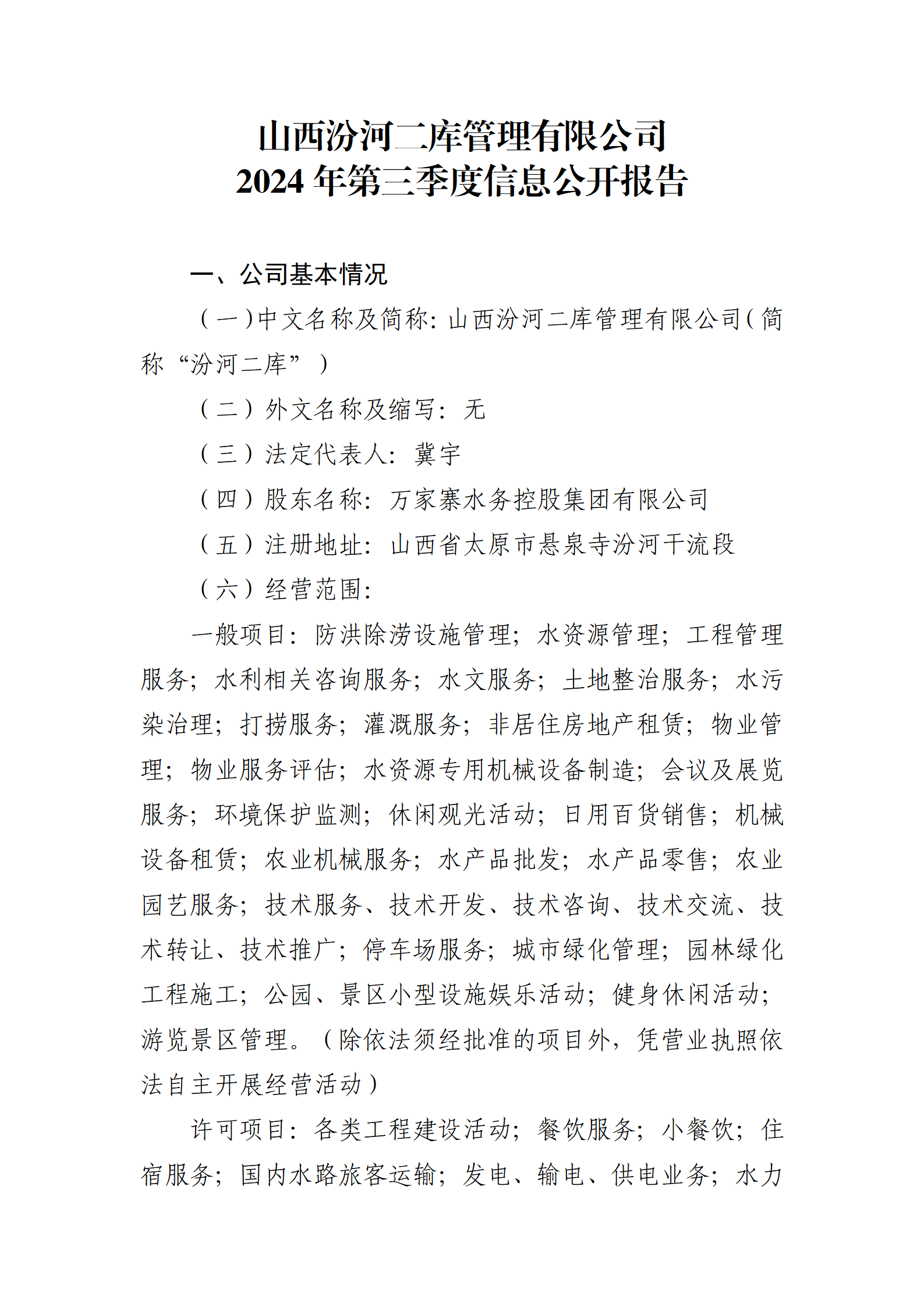 山西汾河二库管理有限公司2024年中期信息公开报告