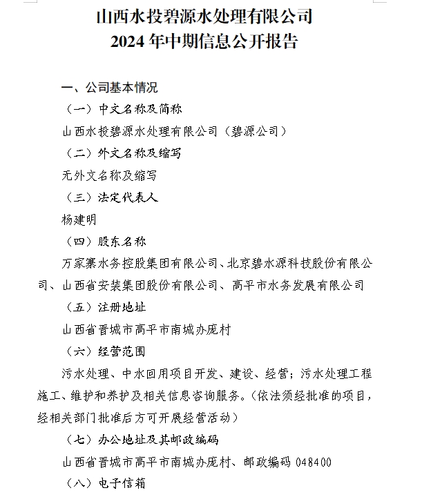 山西水投碧源水处理有限公司2024年第三季度信息公...