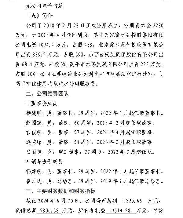 山西水投碧源水处理有限公司2023年度财务等重大信...