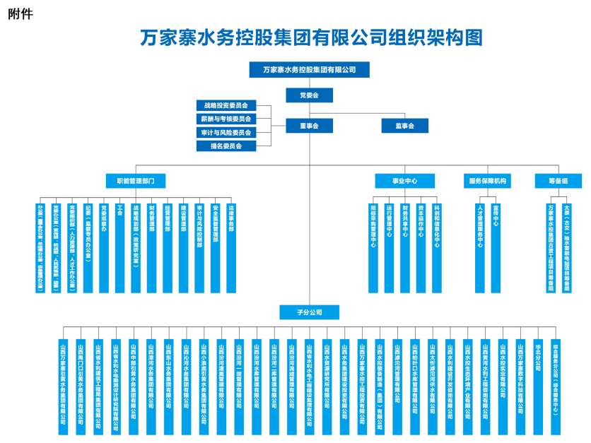 万家寨水务控股集团有限公司是按照省委、省政府改革部署组建的省属国有水务企业。以新设合并方式,在重组山西黄河万家寨水务集团和山西水务投资集团的基础上,划转省水工局、省水利设计院两户企业及省水利厅管理的其他事改企单位。2020年3月20日完成工商注册登记,4月16日正式挂牌。